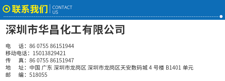 深(shen)圳市華昌(chang)化工有限(xian)公司 電話(huà):13316895978 傳真:0755-26514997 0755-86151947 E-mail:[email protected] 地址(zhi):深圳市龍(long)崗區天安(ān)數碼城4棟(dong)B座1401單元
